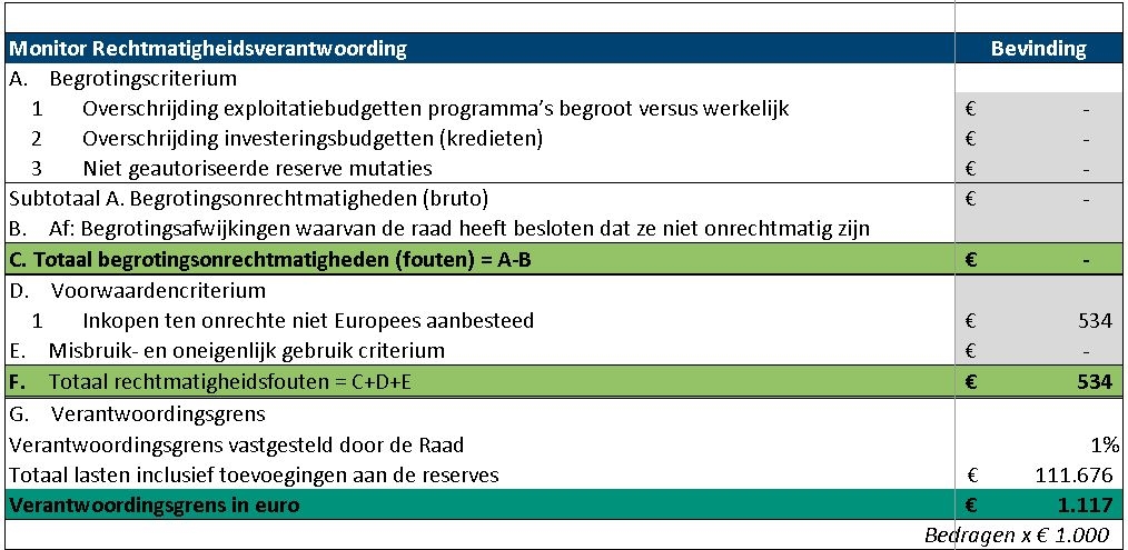 De uitkomsten van de rechtmatigheidsverantwoording worden weergegeven in onderstaande tabel: